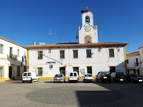 | o edifício dos CTT e, nesta data, à direita, o GIP de Barrancos (2020) |