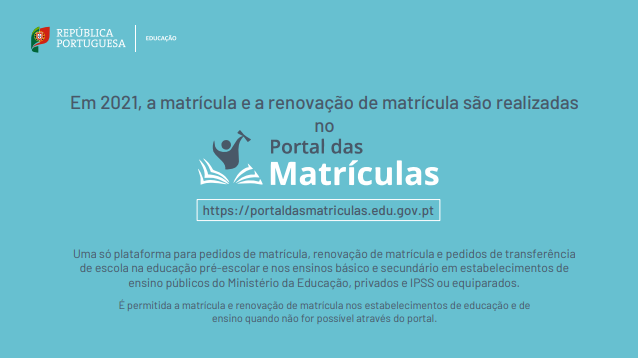 A partir do dia 15 de abril até 30 de junho, o Portal das Matrículas estará disponível para que Encarregados de Educação e Serviços Escolares registem pedidos de matrícula para o Ano Letivo 2021/2022.