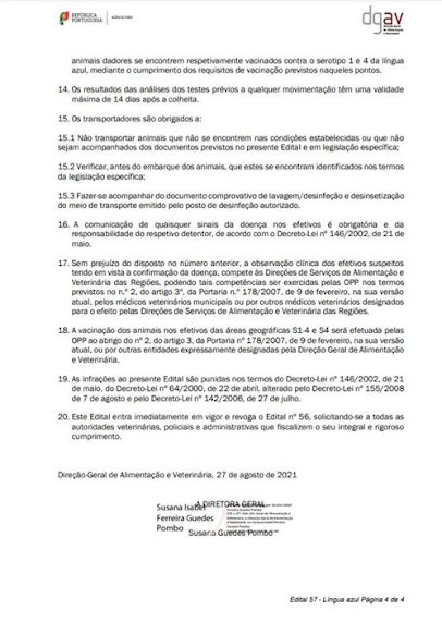 De acordo com a DGVA, "em virtude da deteção de resultados positivos ao serotipo 4 no concelho de Serpa, em agosto de 2021, é definida a região do Alentejo como área adicional de restrição para o serotipo 4, adicionalmente à área geográfica sujeita a restrições por serotipo 1 e por serotipo 4 do vírus da língua azul, que abrange a região do Algarve".
